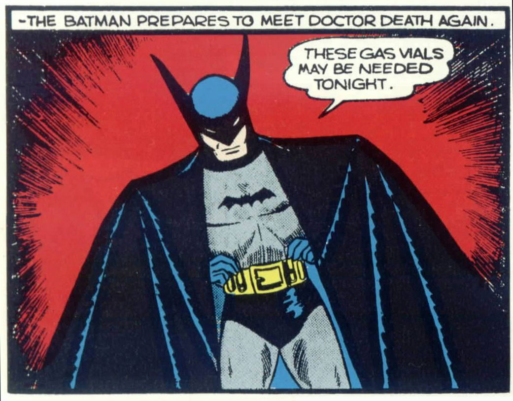Military-grade smoke grendades? Check. Chemical knock-out gas pellets? Check. Custom-made Baterangs? Check. Simple pocket knife? D’oh;